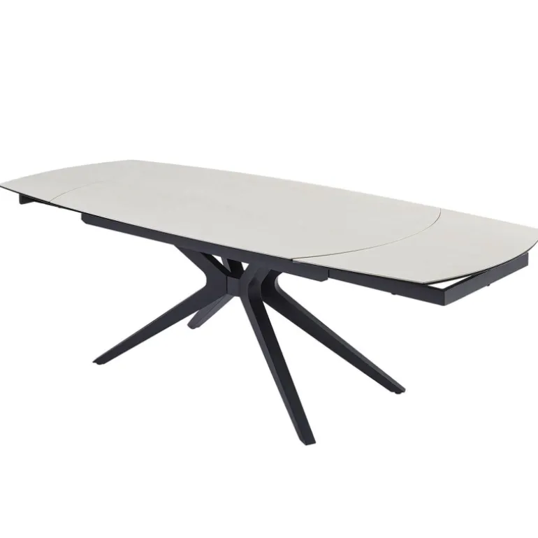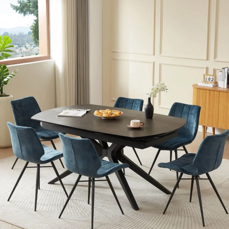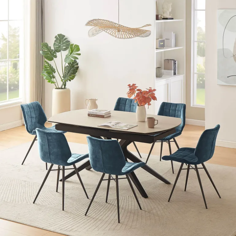 La table à manger extensible Angèle sera une alliée parfaite pour les moments de convivialité. Dotée d’un plateau en céramique raffiné, elle allie esthétisme et robustesse. Eh oui, la céramique est une matière reconnue pour sa résistance aux rayures, à la chaleur et pour sa facilité d’entretien. Ses pieds en métal noir au design moderne apportent, quant à eux, stabilité et style, afin de s’intégrer harmonieusement dans différentes décorations. Grâce à ses 2 allonges intégrées de 40 cm chacune, cette table s’ajuste facilement pour accueillir plus de convives en un clin d’œil. Pour cela, il suffit de réaliser une rotation du plateau principal pour que les extrémités de la table se déploient automatiquement. Disponible en plusieurs coloris, la table Angèle saura s’adapter à vos goûts et à votre décoration d’intérieur.