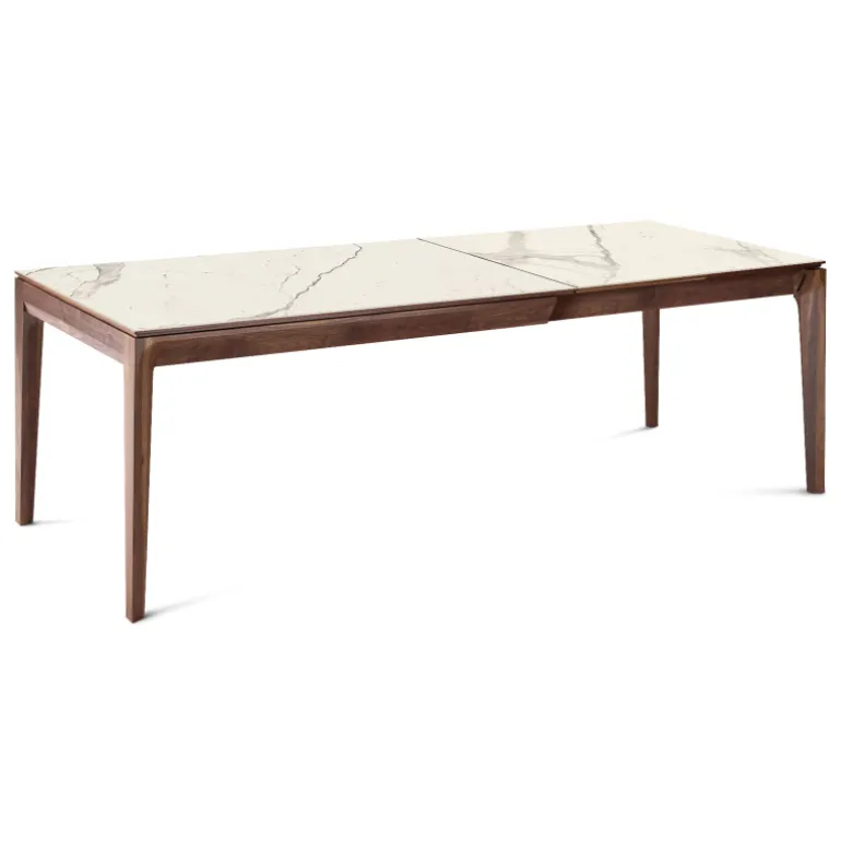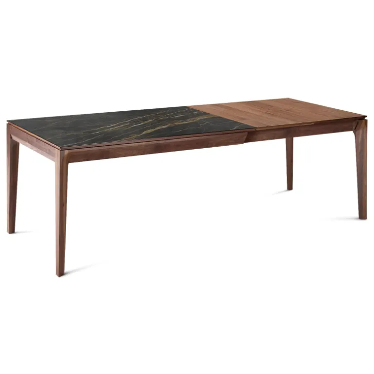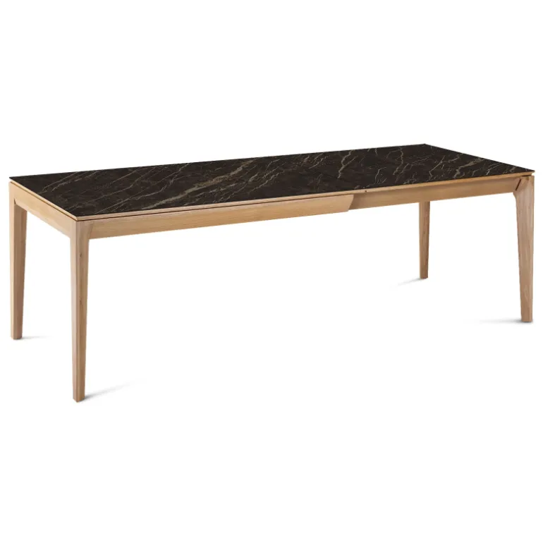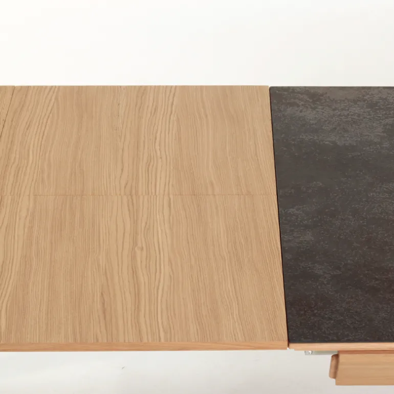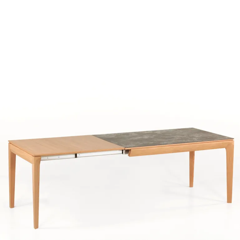La table de séjour Buzz de fabrication traditionnelle française marie avec élégance le bois et la céramique. Son plateau rectangulaire avec un design tout en finesse se décline en plusieurs dimensions et possède au choix 2 allonges en bois ou en céramique.