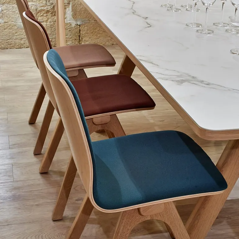 La chaise design Chevron s’inspire des éléments de charpenterie à l’image de ses pieds qui rappellent l’esthétique des poutres. Lorsque l’on se penche sur son design, on adore également son minimalisme où tous les éléments superflus ont été enlevés pour mettre en avant son caractère. La chaise Chevron est composée d’une structure en bois massif et d’une coque en multiplis de bois cintré plaqué chêne de fil pour lui apporter de la souplesse et un confort optimal. L’assise et le dossier sont également habillés d’un revêtement en tissu pour lui insuffler de la douceur. Enfin, cette chaise est personnalisable puisque vous pourrez choisir le coloris du bois et du tissu pour l’adapter à votre décoration d’intérieur.