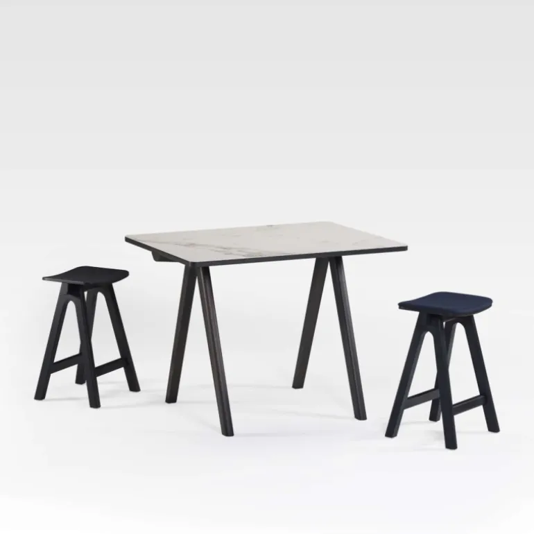 Cette table snack en céramique est née de l’imagination de Guillaume Delvigne et de la marque française Dasras. Ce produit prône une extrême simplicité en supprimant tous les éléments superflus. Son designer s’est inspiré de l’univers de la charpenterie comme le soulignent sa poutre centrale et le design du piétement. Point de vue praticité, cette table possède un plateau en céramique qui est un matériau résistant aux rayures, aux taches et à la chaleur. Cette table pourra être associée à des tabourets snack avec une hauteur d’assise de plus ou moins 65 cm.