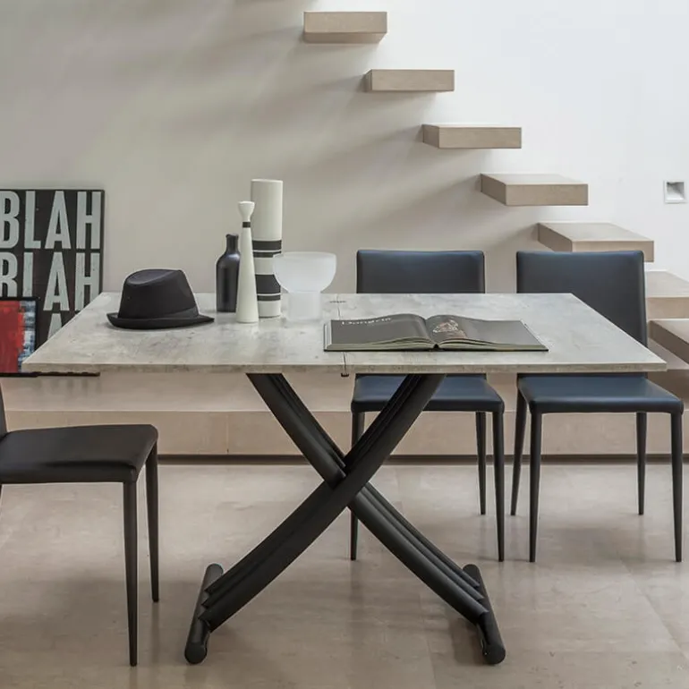 L’alliée des petits espaces, c’est elle. Extensible et relevable, Fenice joue plusieurs rôles. Elle peut être une table basse, une table de salle à manger et même une table de travail. Ainsi, dans votre petit intérieur, vous n’aurez besoin que d’elle seule ! Fenice répond à vos besoins avec raffinement et modernité. Son design est composé d’un plateau rabattable en mélaminé et d’un joli piètement en croix en acier. Sous ces derniers se trouvent des roulettes qui faciliteront ses déplacements. En outre, la table Fenice est personnalisable : un éventail d’options se présente à vous pour le coloris du plateau et du piètement.