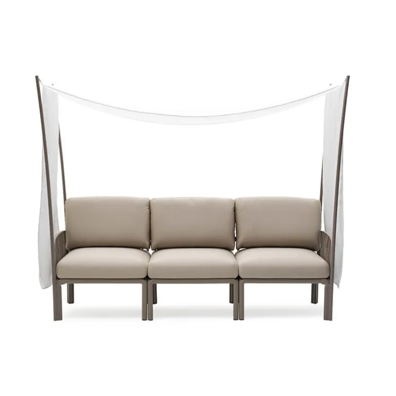 Avec le Komodo Ombra 3, le designer italien Raffaello Galiotto a imaginé un canapé d’extérieur qui allie une assise confortable à une structure qui peut proposer un pare-soleil. Cette dernière est conçue en polypropylène renforcé avec de la fibre de verre et permet d’installer grâce à une extension optionnelle un voile d’ombrage en Velo, un tissu innovant. Celui-ci vous permettra de profiter des belles journées tout en étant protégé des rayons indésirables du soleil. En effet, ce tissu est traité anti-UV. Particulièrement adapté à un usage extérieur, le canapé Komodo Ombra est également traité anti-taches et anti-moisissures. Le voile d’ombrage est facile à installer et désinstaller pour s’adapter à vos envies du moment. Cerise sur le gâteau : ce canapé est personnalisable. Choisissez les coloris qui vous plaisent pour la structure et pour le revêtement de l’assise afin de l’adapter à votre jardin ou terrasse.