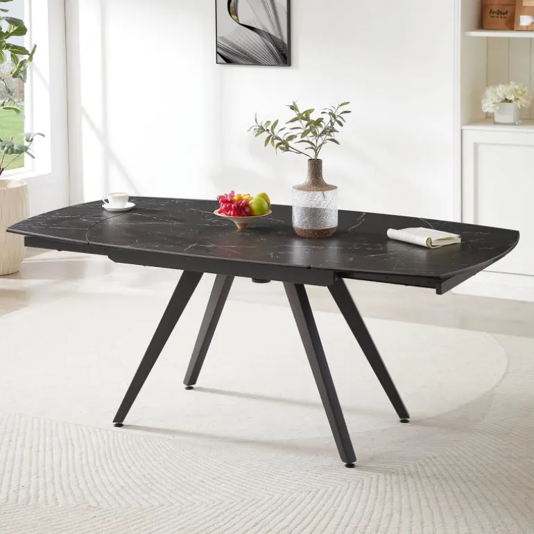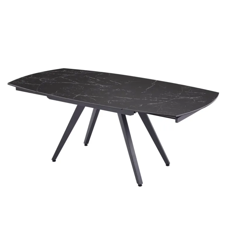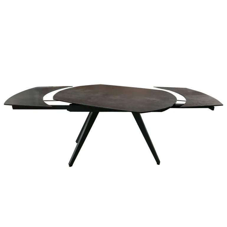La table extensible moderne en céramique Sofia est l’élément parfait pour apporter une touche tendance et fonctionnelle à votre pièce. Son design élégant et la praticité de son plateau en céramique en font un choix idéal pour les repas en famille ou les dîners entre amis. Le plateau de cette table est conçu en céramique, offrant non seulement une esthétique raffinée grâce à sa teinte ardoise, mais aussi une surface résistante aux rayures et à la chaleur. Facile à entretenir, il ajoutera sans aucun doute une note de sophistication à votre pièce de vie. On apprécie également les arrondis présents sur les deux bouts de table qui lui apportent un joli raffinement. Le plateau en céramique repose sur un élégant piétement en métal qui assure stabilité et robustesse à la table. La fonction extensible de la table Sofia lui permet d’accueillir des convives supplémentaires à tout moment. Pour cela, c’est très simple. Il vous suffit de tourner la molette dissimulée sous son plateau afin de pouvoir activer le système d’allonges et de réaliser une rotation du plateau principal pour que les extrémités de la table se déploient automatiquement et vous permettent d’accueillir jusqu’à deux invités supplémentaires. Autre atout : les patins réglables sur ses pieds qui lui offrent une stabilité optimale en toute circonstance. Avec ses lignes épurées et son allure moderne, cette table s’intègre parfaitement à différents styles de décoration intérieure. Son design raffiné ajoute une touche tendance sans compromettre la fonctionnalité.