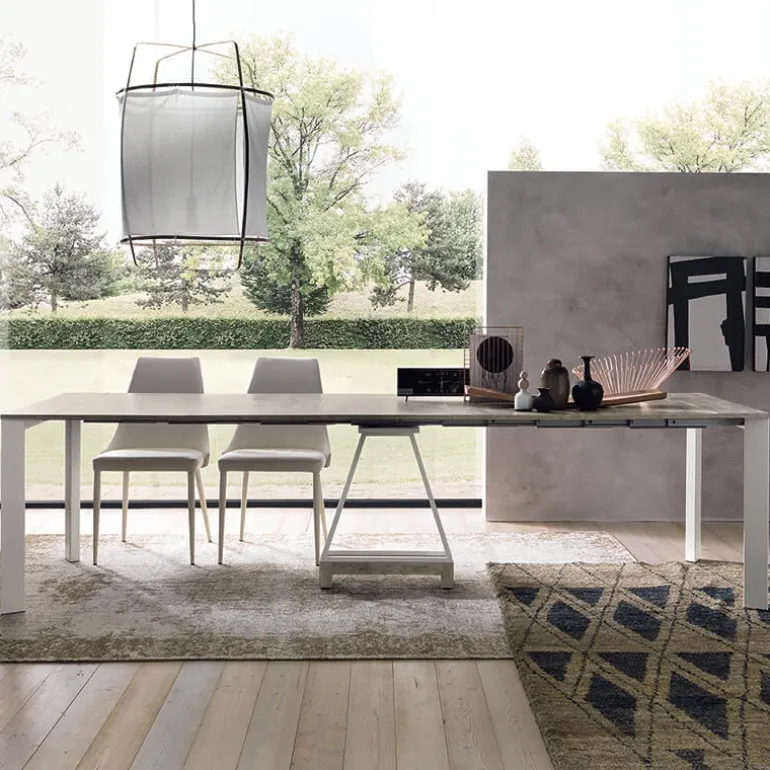 Cette table console extensible est très pratique si vous recherchez une table d’appoint ou que vous souhaitez meubler un studio ou un petit séjour. Contre un mur si vous l’utilisez comme console ou bien au centre de votre salle à manger lorsqu’elle est transformée en table de repas, elle se veut pratique et esthétique. Facilement adaptable à votre décoration intérieure, grâce aux nombreux coloris disponibles pour son plateau en mélaminé et sa structure métallique, cette console avec allonges trouvera facilement sa place chez-vous. Le modèle standard est équipé d’un pied central en métal rétractable apportant une stabilité optimale (non visible sur les photographies). Le rack de rangement triangulaire Extenso AC006 visible sur les photographies du modèle avec la structure blanche est disponible uniquement sur devis. Il permet de soutenir la structure et est une alternative au pied central en métal rétractable. Il peut également servir de range-allonges contrairement au pied central standard et possède des roulettes cachées sous ses pieds. Si vous souhaitez pouvoir ranger facilement vos allonges sous votre table, optez pour cette option en demandant un devis. En optant pour la table en achat direct, les allonges devront être rangées séparément de la console.