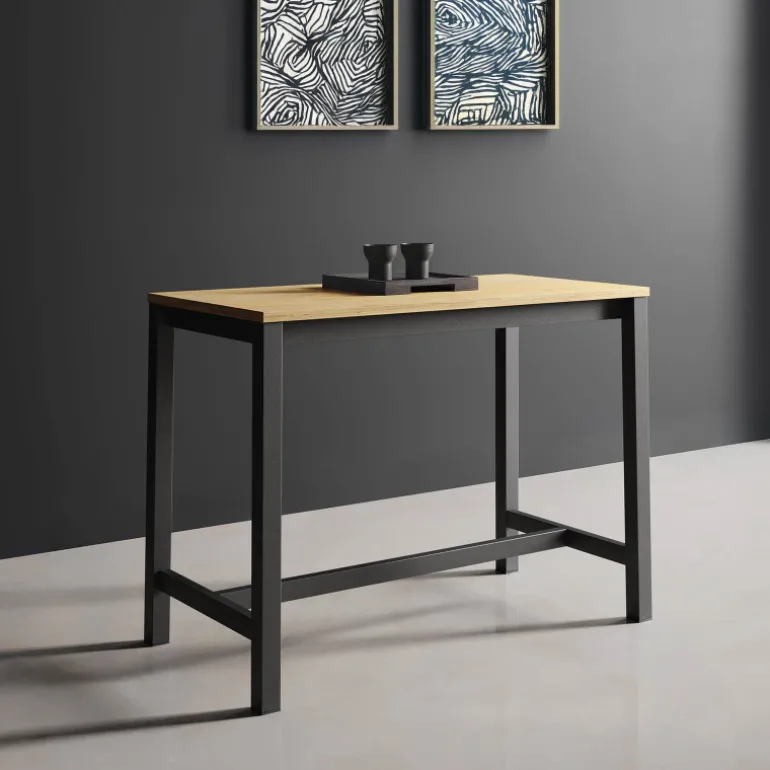 D’une hauteur de 90 cm, la table snack de cuisine Valériane peut être associée à des tabourets d’environ 65 cm de haut. Créez un ensemble harmonieux afin de rendre votre coin repas unique. Le plateau en stratifié imitation chêne naturel repose sur des pieds carrés en métal noir. L’association de ces deux teintes lui apporte du caractère. Côté entretien, rien de plus facile puisque le stratifié tout comme le métal sont faciles à entretenir au quotidien. La table Valériane est parfaite pour les petites cuisines grâce à la faible largeur de son plateau. Eh oui, celui-ci mesure 120 x 60 cm !