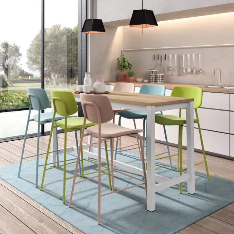 La forme longiligne de la table Vienna en fait un produit parfaitement adapté à une cuisine. Composée d’un plateau en stratifié facile à entretenir et d’une structure en métal carrée de 5 x 5 cm avec des renforts, elle saura par sa simplicité et sa faible largeur devenir un élément central de votre cuisine. Sa hauteur de 90 cm lui permet d’être associée à des tabourets snack de plus ou moins 65 cm de haut. A noter que la finition HA reprend l’apparence du bois avec une finition irrégulière donnant un aspect naturel.
