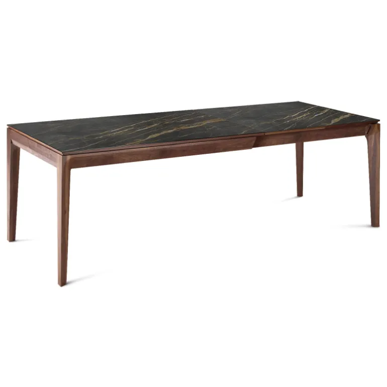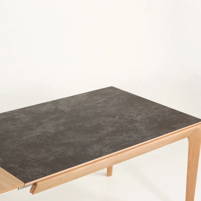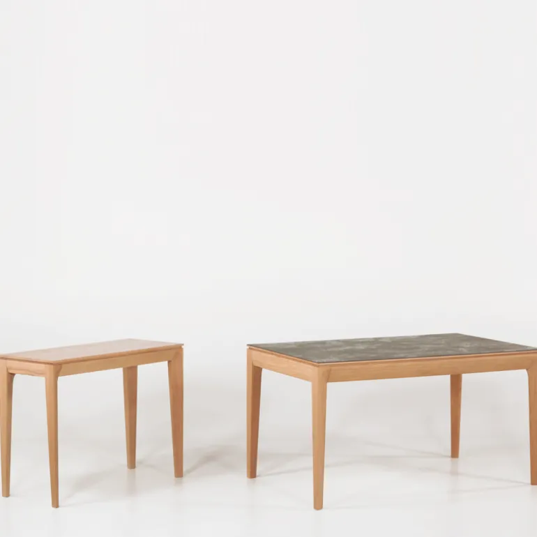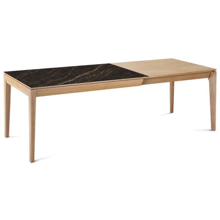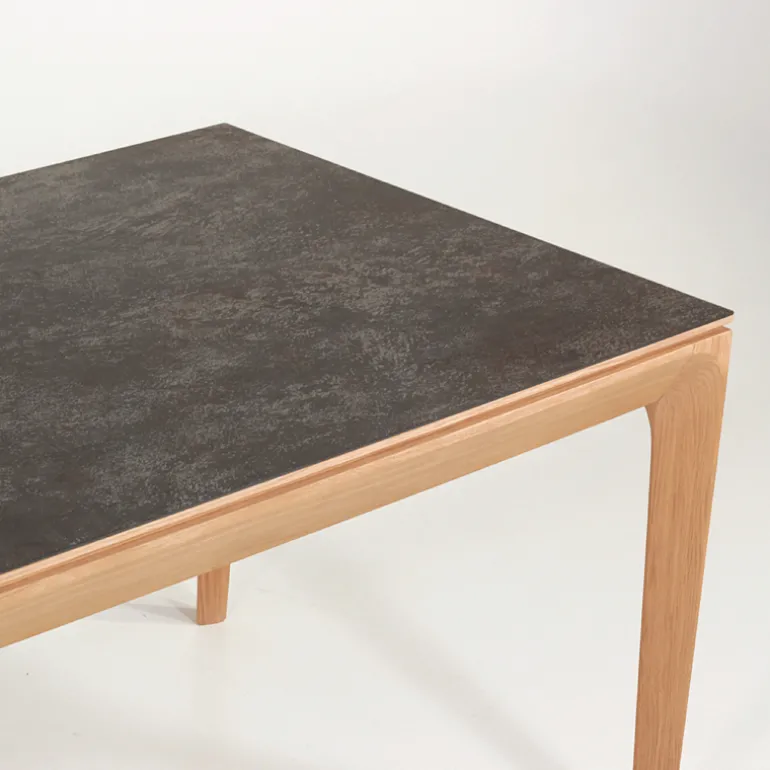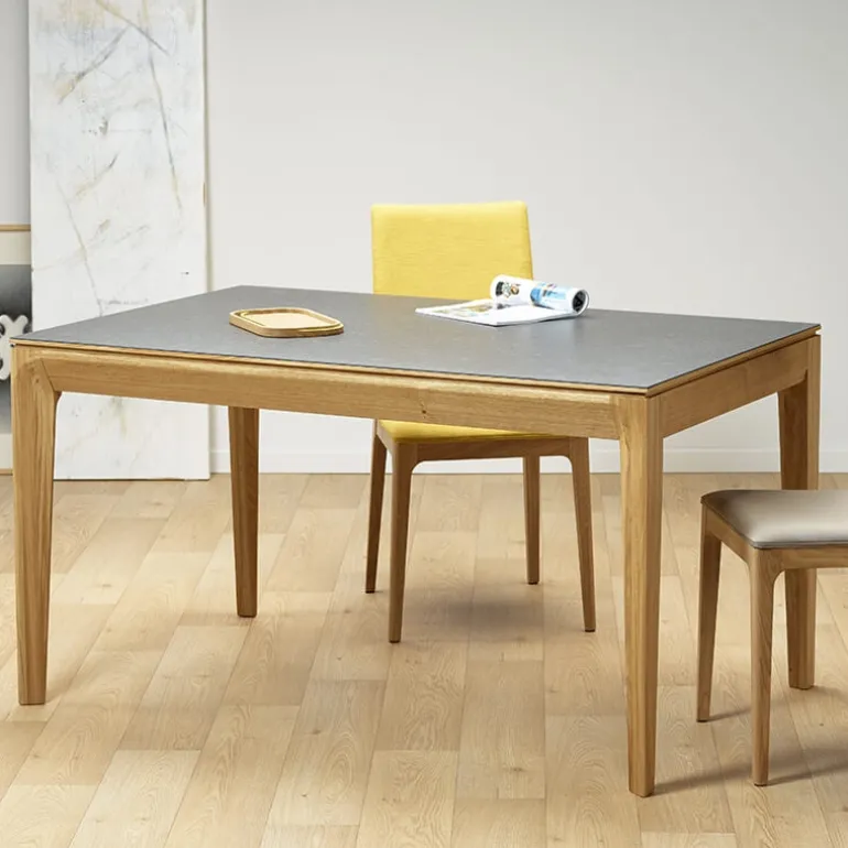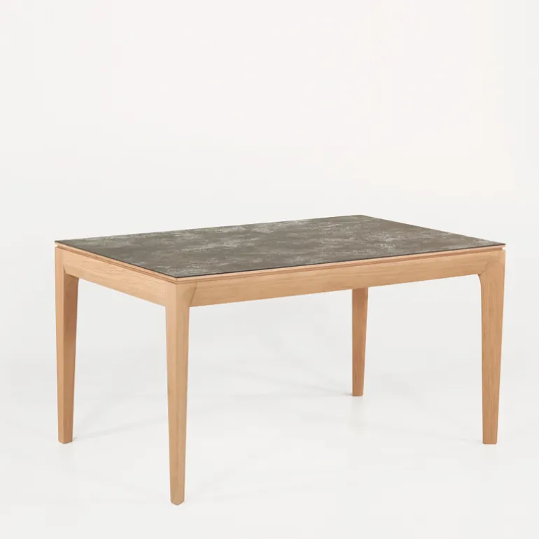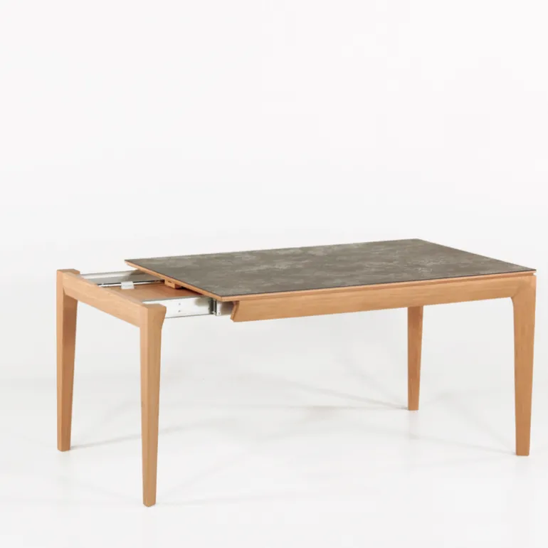 La table de séjour Buzz de fabrication traditionnelle française marie avec élégance le bois et la céramique. Son plateau rectangulaire avec un design tout en finesse se décline en plusieurs dimensions et possède au choix 2 allonges en bois ou en céramique.