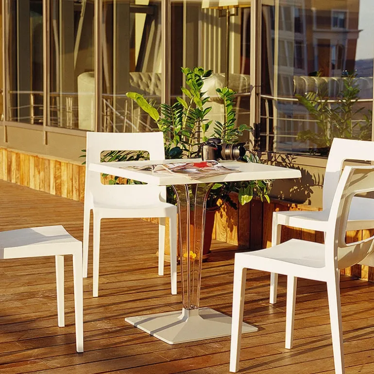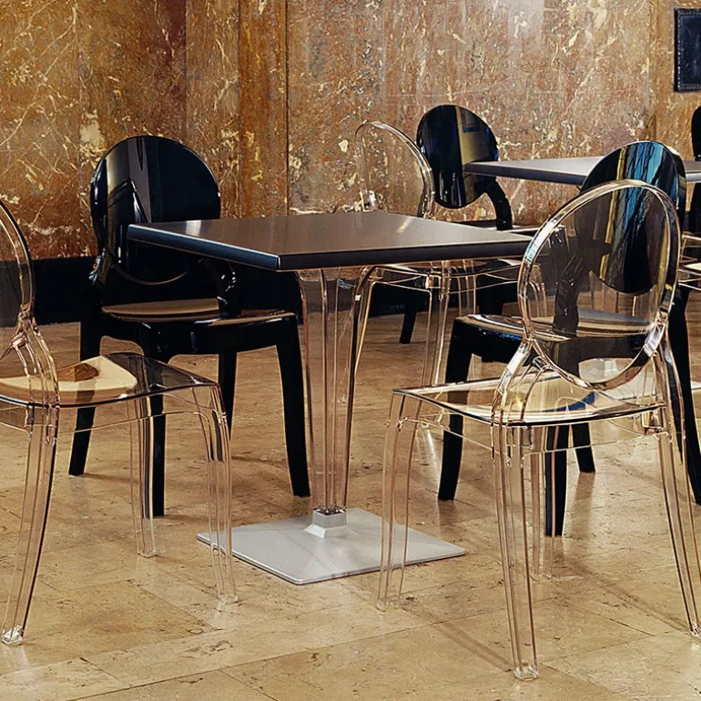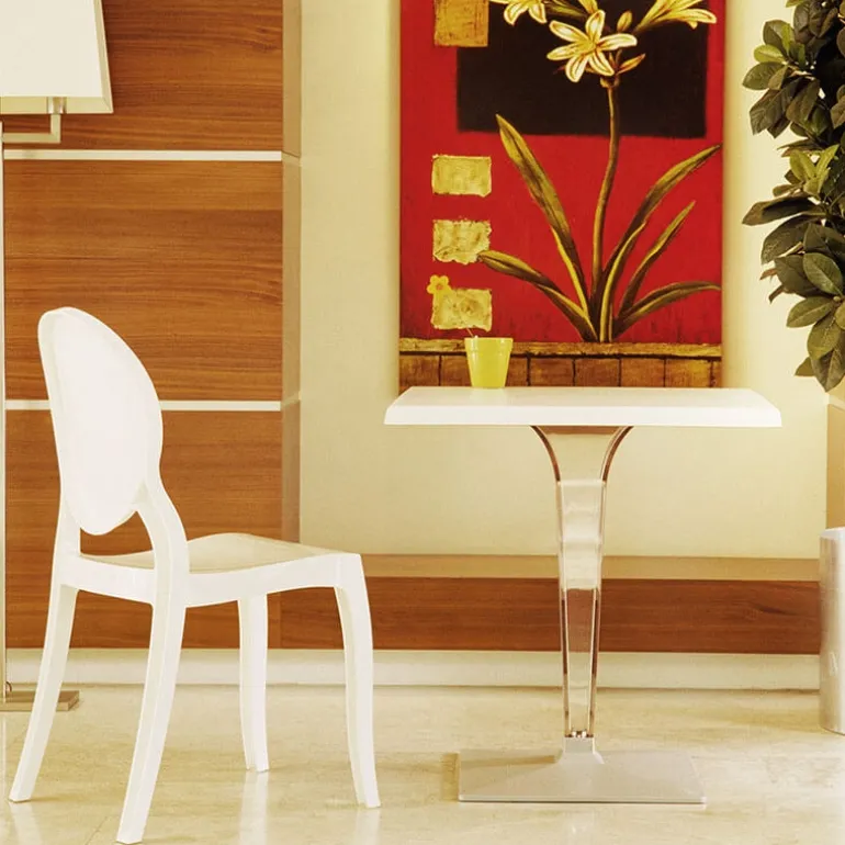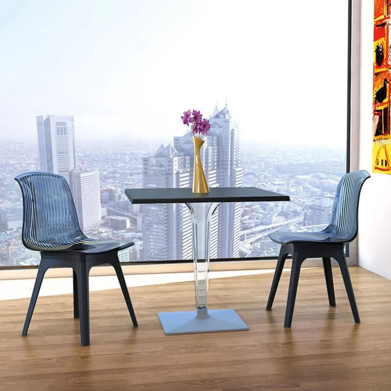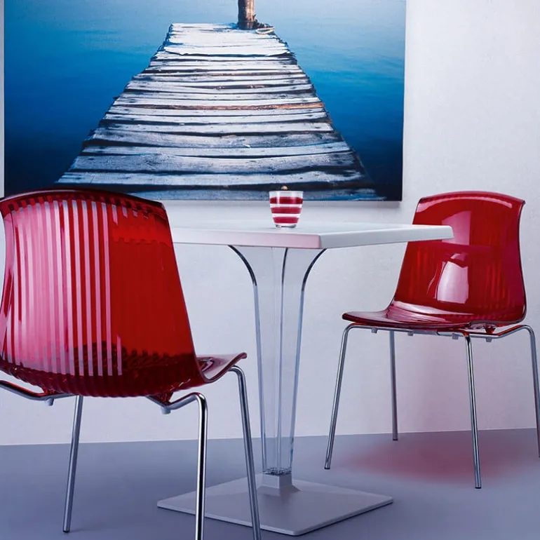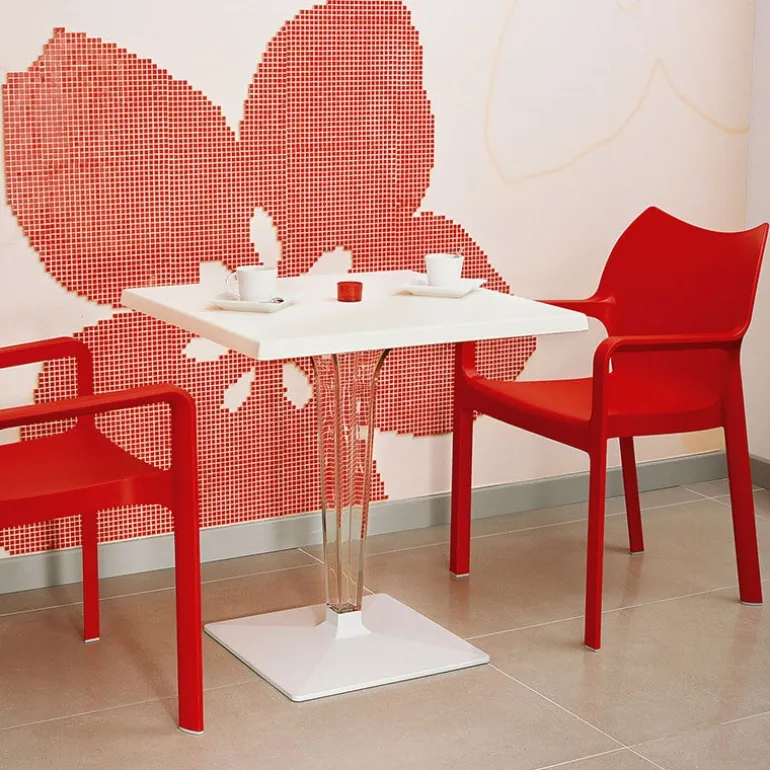 La table carrée design Ice est disponible en deux dimensions et saura s’adapter à toutes les situations. Elle comporte une colonne transparente en polycarbonate posée sur un socle en aluminium gris et un plateau disponible en plusieurs coloris au choix. Le plateau de cette table est composé en stratifié moulé werzalit. Les différents matériaux qui composent la table carrée design Ice s’harmonisent parfaitement pour créer un modèle design aux lignes élégantes.