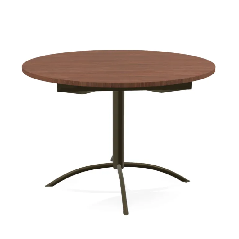 La table ronde extensible Laser d’un diamètre de 110 cm possède un plateau en stratifié. A vous de sélectionner le coloris qui vous convient et qui s’intègrera à merveille dans votre intérieur. Il est installé sur un pied en métal avec une base à 4 branches de 35 mm de diamètre chacune. Le pied central disponible en plusieurs coloris a un diamètre de 70 mm. L’allonge centrale en portefeuille automatique de 40 cm est rangée sous le plateau de la table Laser. La ceinture est en époxy alu. Le plateau est proposé en stratifié classique ou en stratifié HA. Ce dernier est contrasté au toucher comme le bois, ce qui renforce son authenticité.