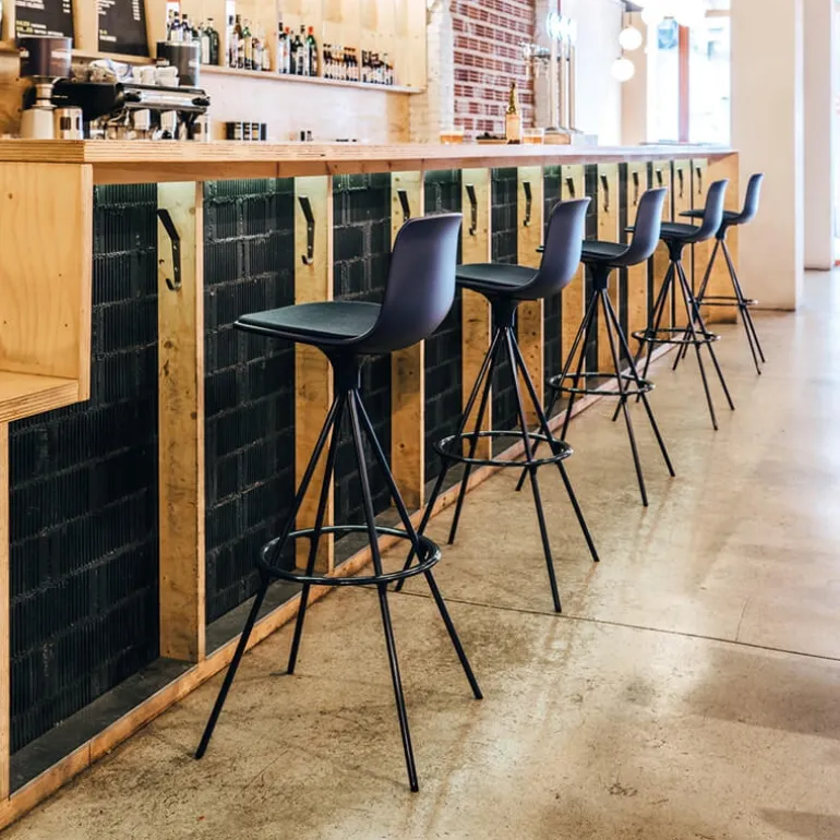 Matériaux résistants et durables, facile à entretenir et pouvant supporter un poids maximum de 120 kg. Structure en métal laqué époxy ou chromé au choix, repose pied coloris assorti à la structure du tabouret, coque en polypropylène de couleurs. Assise pivotante. Possibilité d’avoir une galette sur l’assise de la coque (uniquement sur devis, cf. photographie du modèle noir).