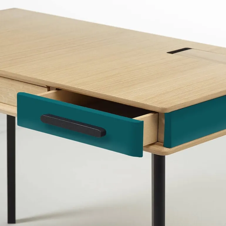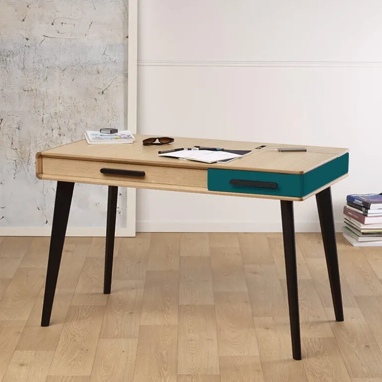 On ne peut pas nier le charme authentique et élégant de ce bureau en bois ! Son design simple et moderne fait de lui un meuble tendance. On aime sa petite touche originale avec son tiroir de couleur en bois laqué. Que vous disposiez ou non d’un bureau, il trouvera facilement une place dans votre intérieur. En effet, vous pouvez très bien décider de le placer dans un coin ou contre un mur de votre salle à manger ou encore dans votre chambre. Pratique, ce bureau tendance doté de tiroirs vous permettra de ranger vos papiers ou dossiers en cours tout en les ayant à portée de main. Un plumier est également présent. Enfin, sachez qu’il s’agit d’un bureau personnalisable. Vous pourrez ainsi choisir le coloris du plateau, des pieds mais aussi du tiroir parmi plusieurs teintes. À noter que le coloris des poignées est automatiquement le même que le coloris des pieds.