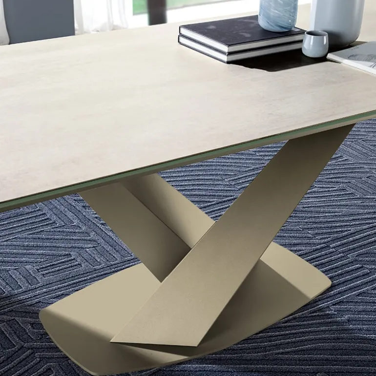 Très tendance, la table de salle à manger en céramique Victory séduit par son style unique. De fabrication espagnole, elle possède un plateau fin en céramique et un pied central design en acier qui forme un V. La forme de celui-ci apportera un brin d’originalité à votre intérieur. Design, cette table de repas tendance est également résistante grâce à ses matériaux de qualité. Elle est également pratique puisqu’elle a été dotée d’allonges en céramique. Grâce à cette table extensible, vous pourrez partager de délicieux repas entre amis ou bien en famille. Vous êtes séduit ? Alors il ne vous reste plus qu’à la personnaliser en sélectionnant les dimensions ainsi que les coloris du plateau et du pied central.