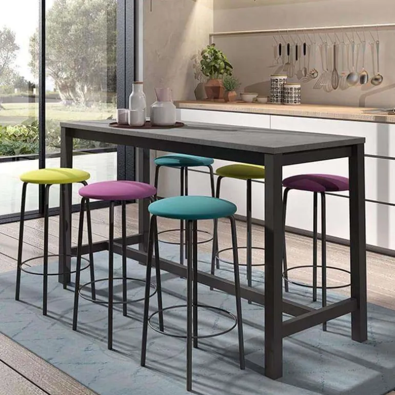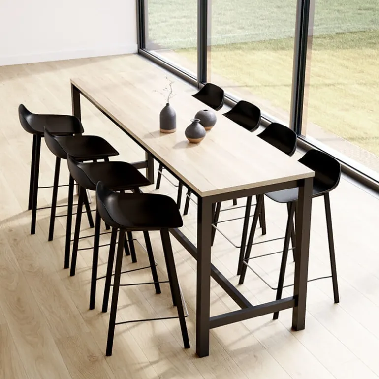 La forme longiligne de la table Vienna en fait un produit parfaitement adapté à une cuisine. Composée d’un plateau en stratifié facile à entretenir et d’une structure en métal carrée de 5 x 5 cm avec des renforts, elle saura par sa simplicité et sa faible largeur devenir un élément central de votre cuisine. Sa hauteur de 90 cm lui permet d’être associée à des tabourets snack de plus ou moins 65 cm de haut. A noter que la finition HA reprend l’apparence du bois avec une finition irrégulière donnant un aspect naturel.